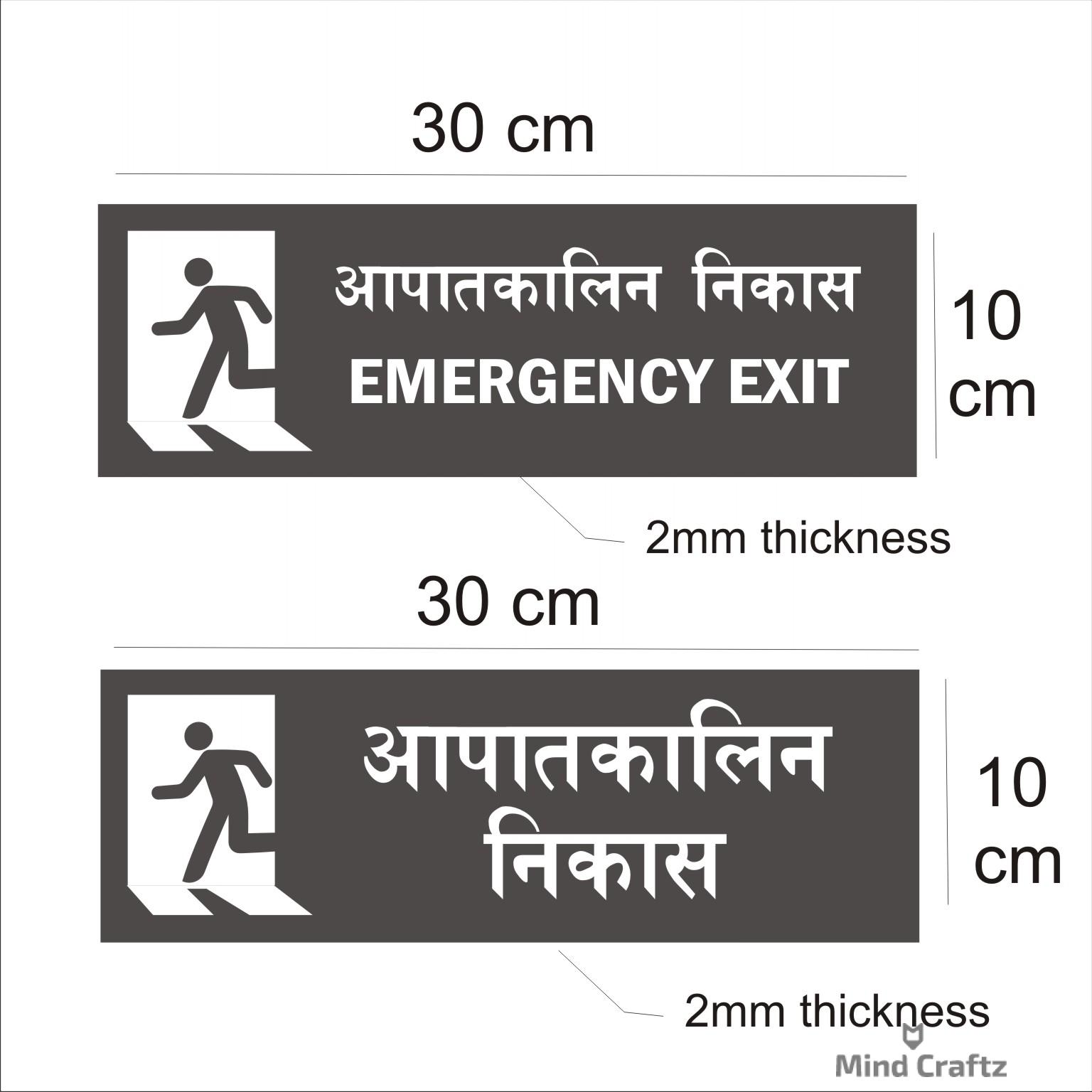 Emergency Exit Combo Hindi and English Sign Board Pack of 2 |Silver Color 2mm Thickness | 12 x 4 inches. Easy installation : Double Side Tape at Backside Material: Vinyl, Acrylic Thickness: 2 mm Dimension (Width X Height ) : 30 cm x 10 cm, High Water Resistant. Acrylic Sign Boards for offices, showrooms, shops, malls, clinics, Factories,warehouse, apartments, showrooms etc. High Quality warning Emergency Signboards.