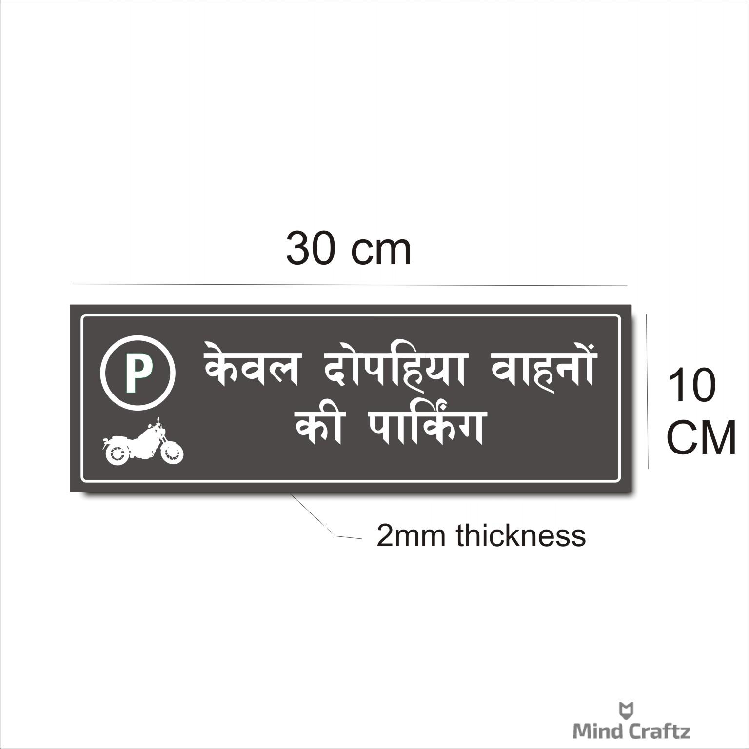 Parking Two Wheelers Only Hindi Sign Board Pack of 1 | Silver Color 2mm Thickness | 12 x 4 inches. Easy installation : Double Side Tape at Backside Material: Vinyl, Acrylic Thickness: 2 mm Dimension (Width X Height ) : 30 cm x 10 cm, High Water Resistant. Acrylic Sign Boards for offices, showrooms, shops, malls, clinics, Factories,warehouse, apartments, showrooms etc. High Quality warning Emergency Signboards.