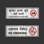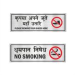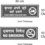 Please Remove your shoes here and No Smoking Acrylic Sign Board combo Silver Color 12 x 4 inches 2mm thick Pack of 2 Hindi English . Easy installation : Double Side Tape at Backside Material: Vinyl, Acrylic Thickness: 2 mm High Water Resistant. Acrylic Sign Boards for offices, showrooms, shops, malls, clinics, Factories,warehouse, apartments, Godowns, Stairs, Lobby, Halls, showrooms etc. High Quality warning Emergency Signboards.