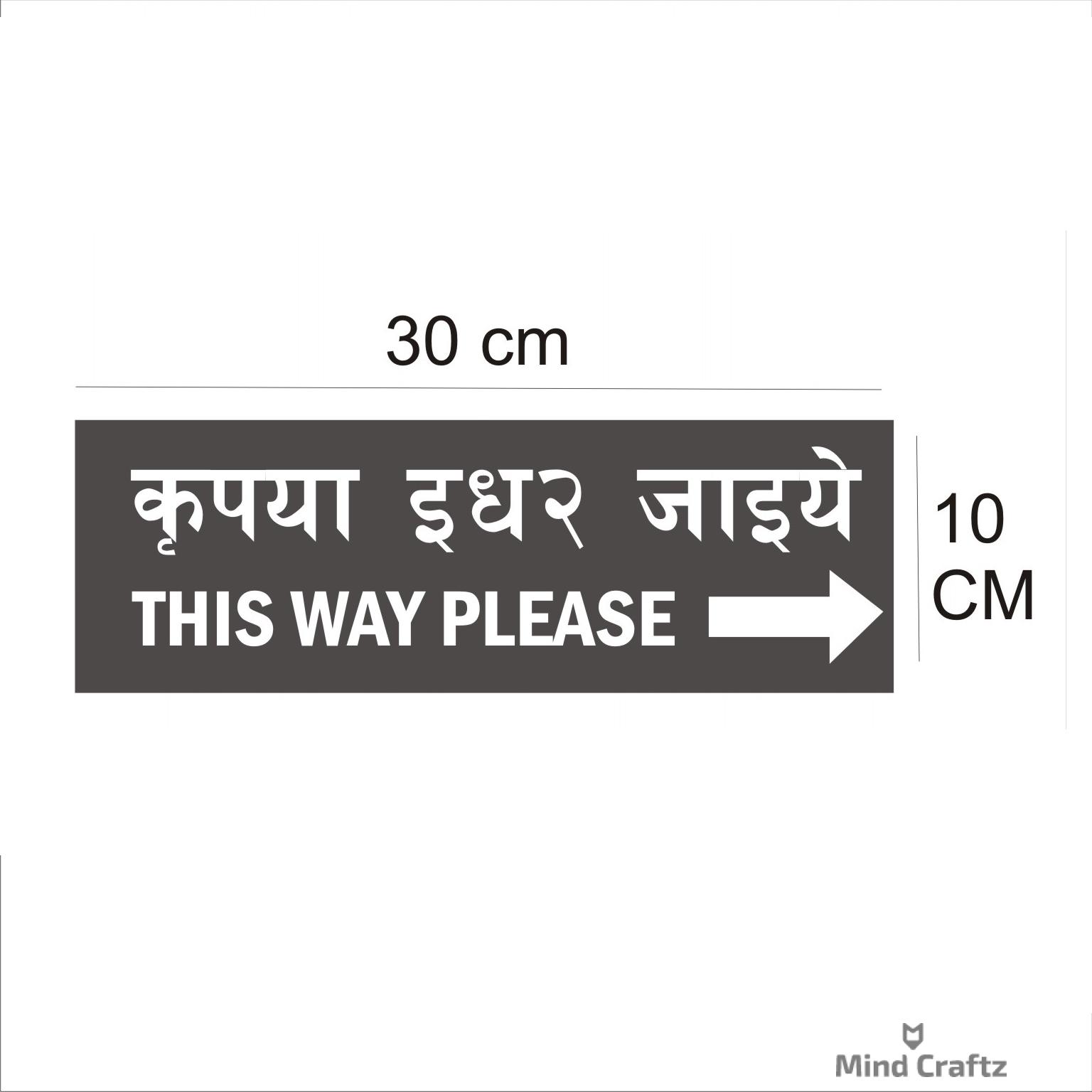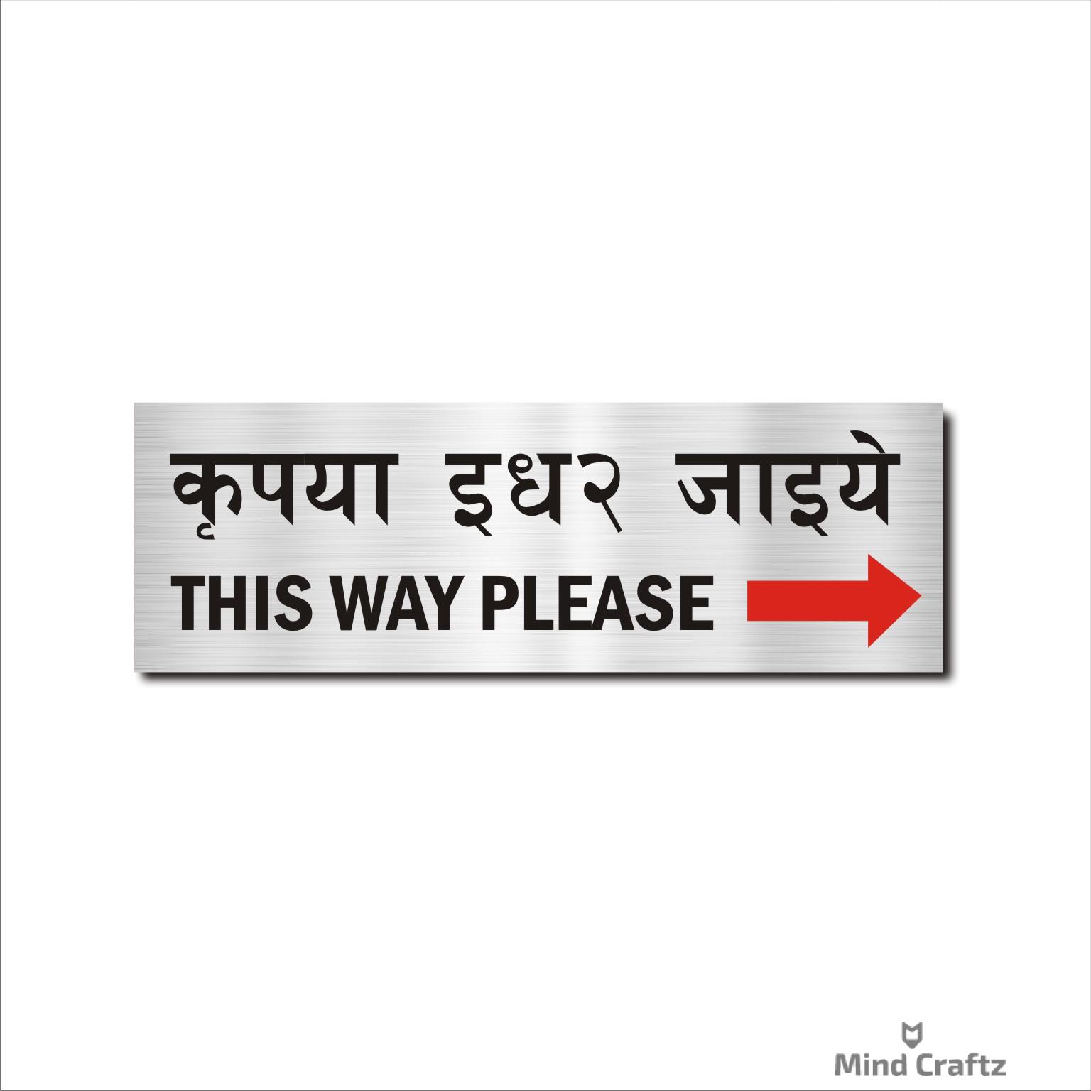 This Way Please Right Arrow Hindi and English Acrylic Sign Board Silver color | 12 x 4 inches 2mm thick – 1 Piece. Attractive color Hindi Signboards Easy Installation: Double Tape a Back side. High Water Resistant. Suitable for Office, Building, apartments, Hotels, Restaurants, shops, Godowns, Lodge, Schools, Colleges, Paying Guest, Hostels etc.