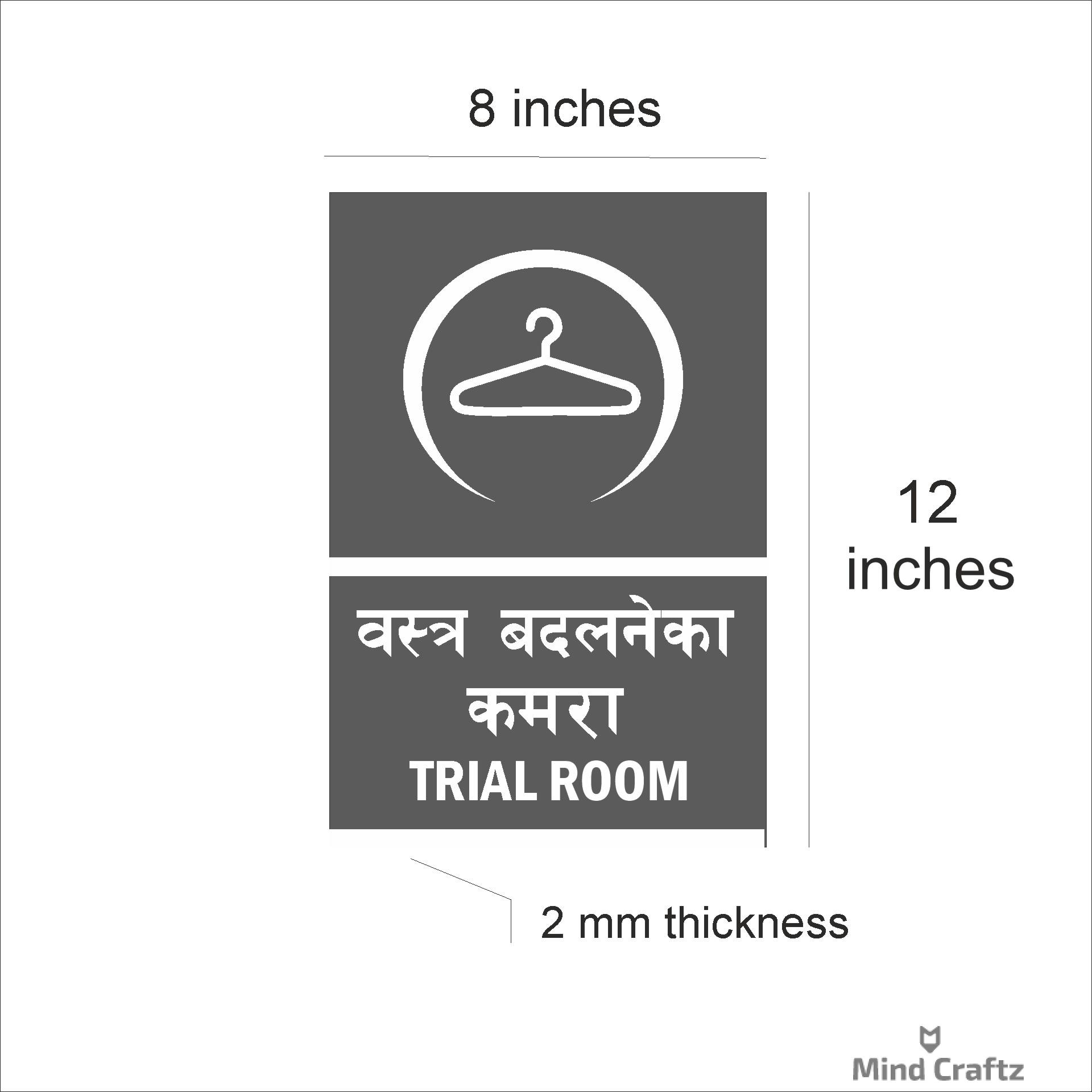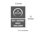 Trail Room Acrylic Sign Board Single Blue Color 8 x 12 inches 2mm thick Pack of 1 Hindi English . Easy installation : Double Side Tape at Backside Material: Vinyl, Acrylic Thickness: 2 mm High Water Resistant. Acrylic Sign Boards for offices, showrooms, shops, malls, clinics, Factories,warehouse, apartments, Godowns, Stairs, Lobby, Halls, showrooms etc. High Quality warning Emergency Signboards.