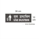 Use Dustbin Combo Hindi and English Sign Board Pack of 1 | Silver Color 2mm Thickness | 12 x 4 inches. Easy installation : Double Side Tape at Backside Material: Vinyl, Acrylic Thickness: 2 mm Dimension (Width X Height ) : 30 cm x 10 cm, High Water Resistant. Acrylic Sign Boards for offices, showrooms, shops, malls, clinics, Factories,warehouse, apartments, showrooms etc. High Quality warning Emergency Signboards.