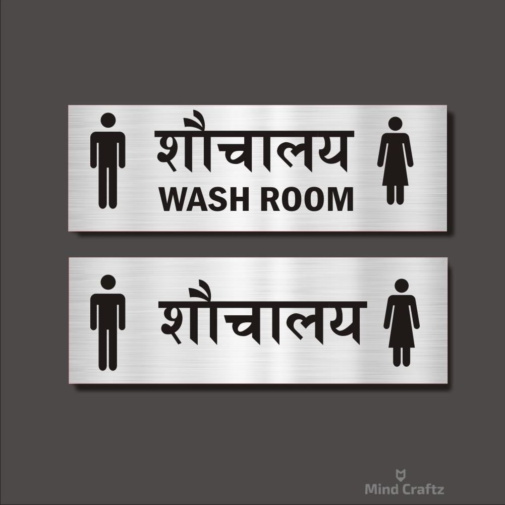 Wash Room Hindi and English Acrylic Combo Sign Board Silver Color | 12 x 4 inches | 2mm Thickness – 2 Piece. Attractive color Hindi Signboards Easy Installation: Double Tape a Back side. High Water Resistant. Suitable for Office, Building, apartments, Hotels, Restaurants, shops, Godowns, Lodge, Schools, Colleges, Paying Guest, Hostels etc.
